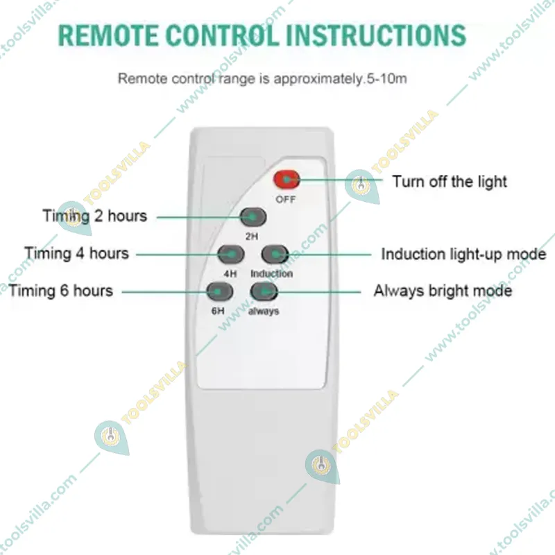- Timer Mode : Users can set the light to remain on at full brightness for a predetermined duration (2, 4, or 6 hours) before automatically turning off.